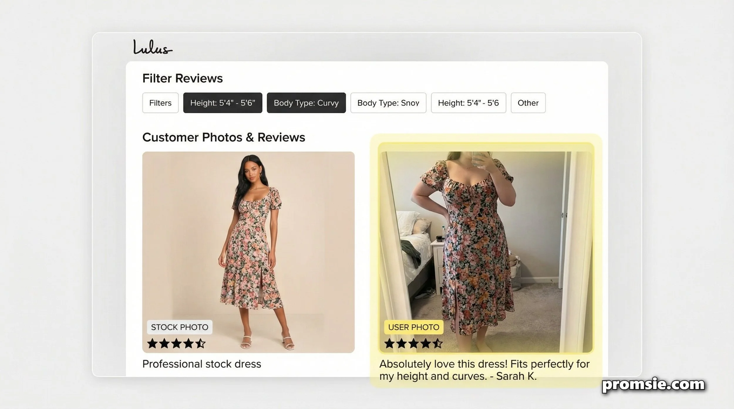 If you are 5'2" and curvy, you don't have to guess how the hem will fall. You can go to the reviews, filter for '5ft - 5ft 4in' and 'Curvy,' and see fifty other girls with your exact build wearing that specific dress. You can see where the fabric pulls, if the slit is too high, or if the bust runs large.