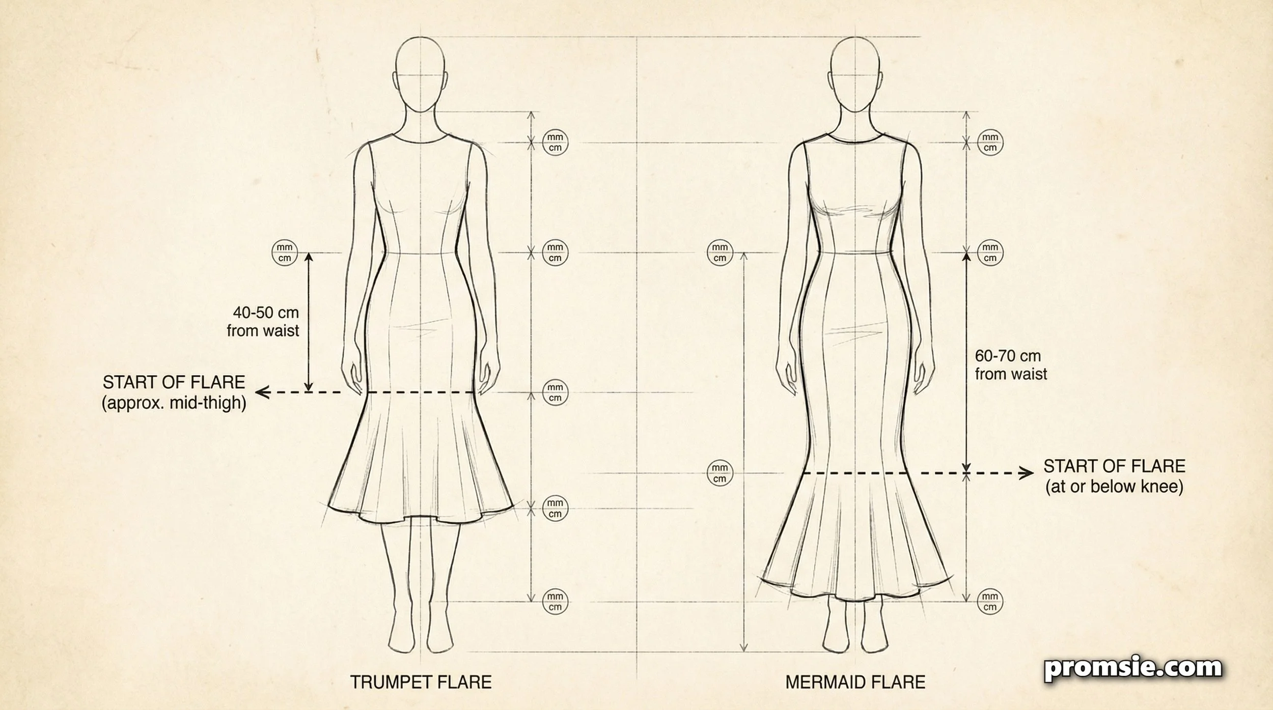 A trumpet skirt begins its flare at the mid-thigh. Imagine the bell of a trumpet musical instrument. It is a gradual, softer widening that starts just past the hips but well above the knee. This creates a balanced, elongated look that does not aggressively restrict your legs.