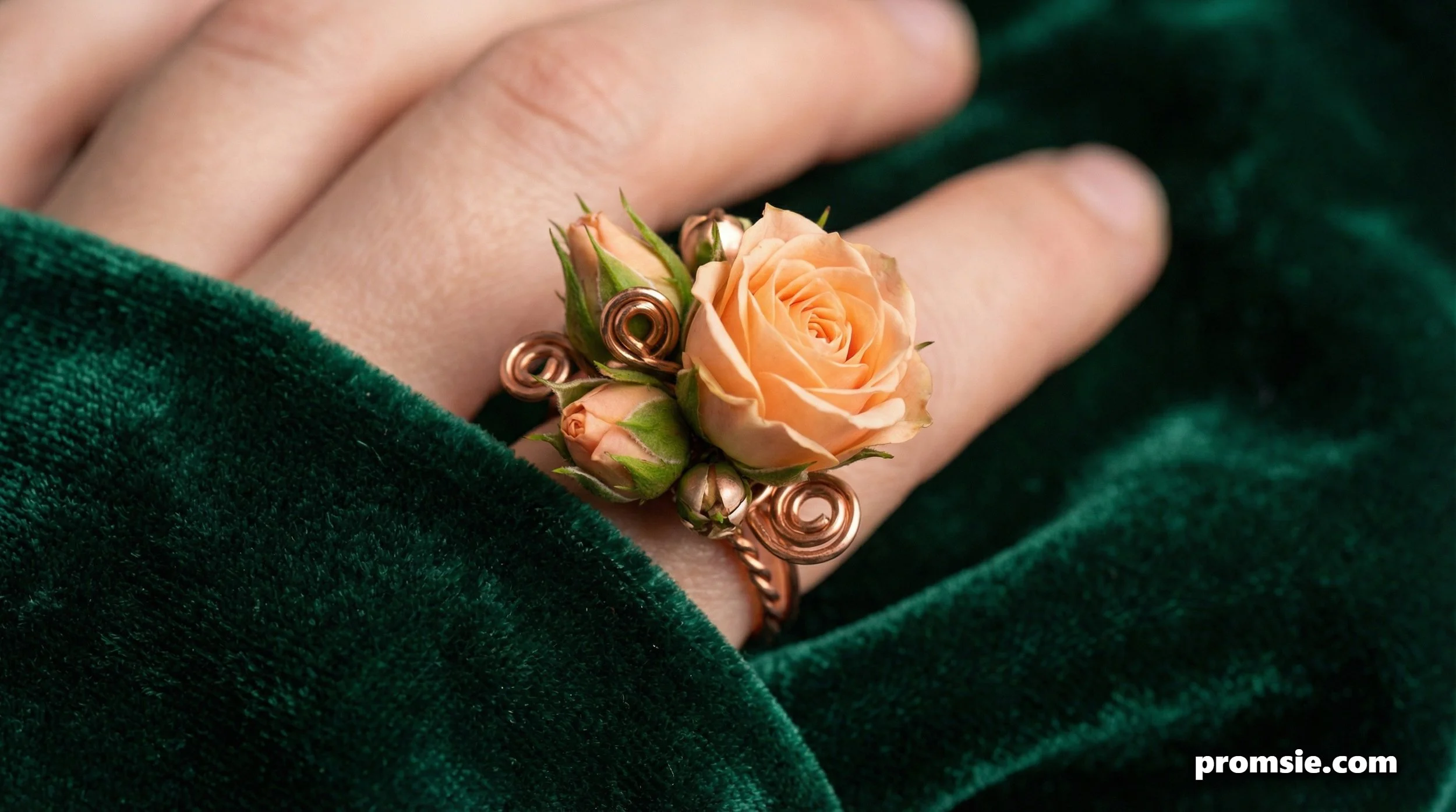 The solution taking over feeds right now is the Ring Corsage. This is a miniature, structural arrangement mounted directly onto a gold or silver adjustable band. It sits on the finger just like a statement cocktail ring, but it is made of fresh blooms.