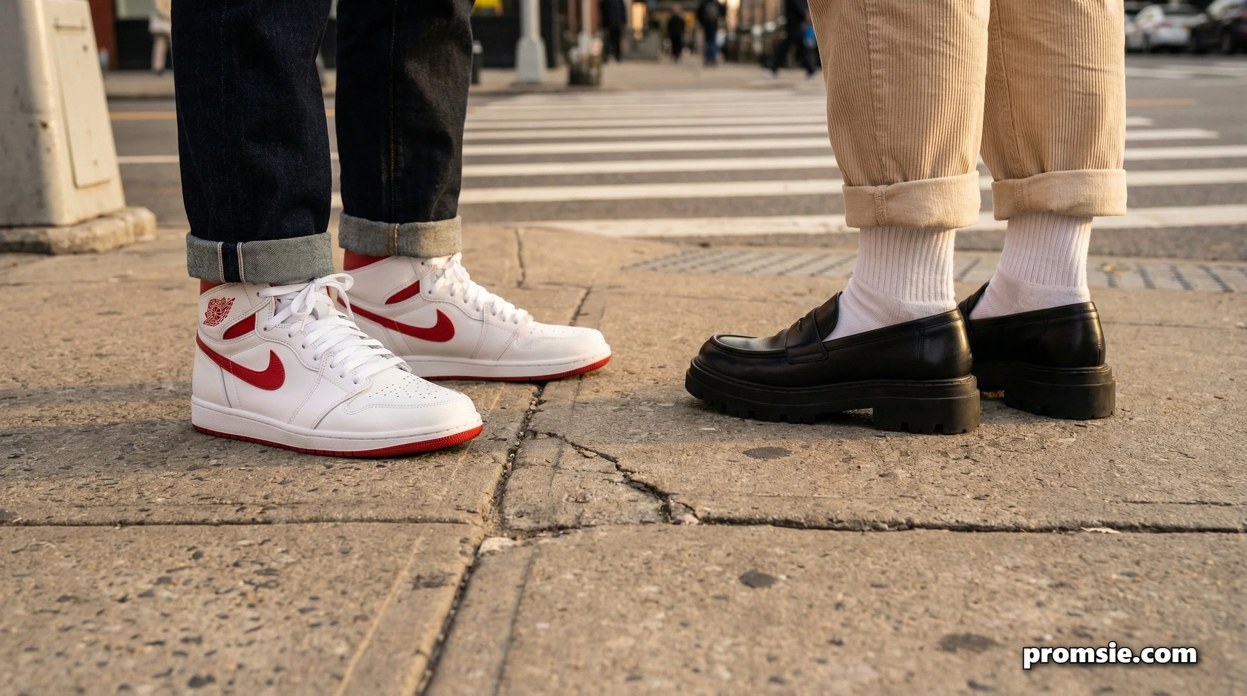 The Street-Luxe archetype demands a sneaker that is intentional. We are talking about high-fashion silhouettes—minimalist leather sneakers in pristine white or black, or high-concept designs like Jordan 1s or 11s, provided the colorway coordinates with the outfit.