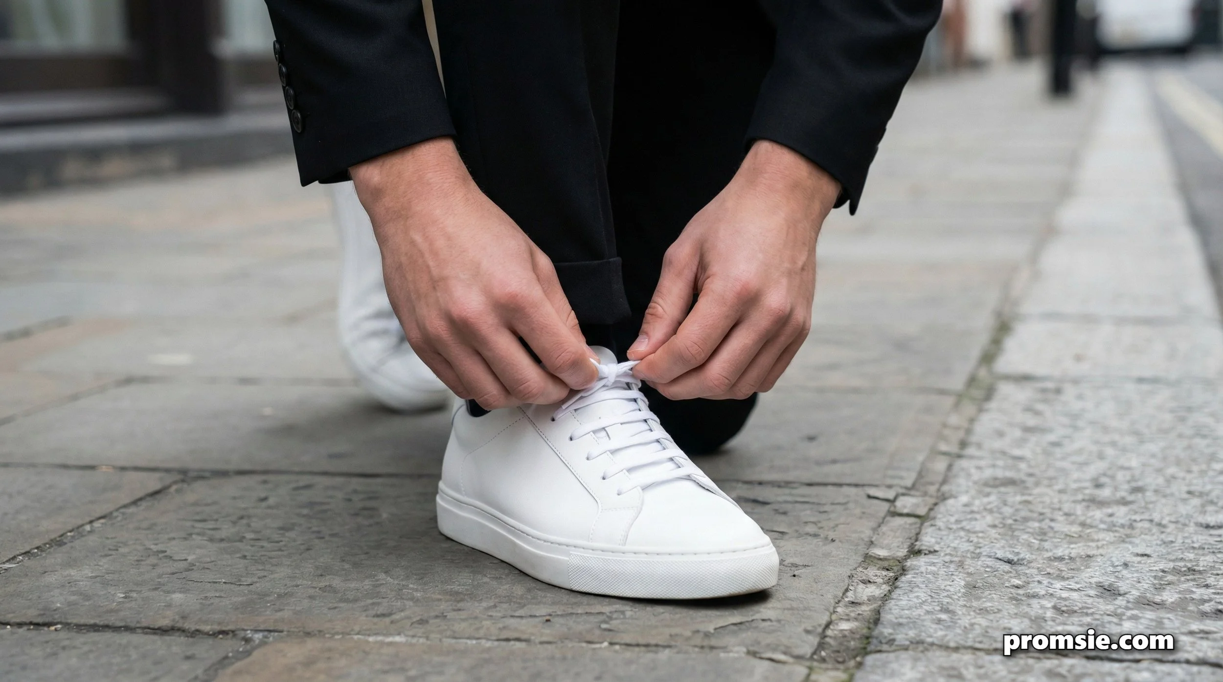The sneaker suit trend for the Class of 2026 relies on high-end, solid-color leather trainers. Think Common Projects or similar silhouettes—clean white, monochromatic black, or deep navy leather. No mesh, no athletic logos, and absolutely no running shoes.