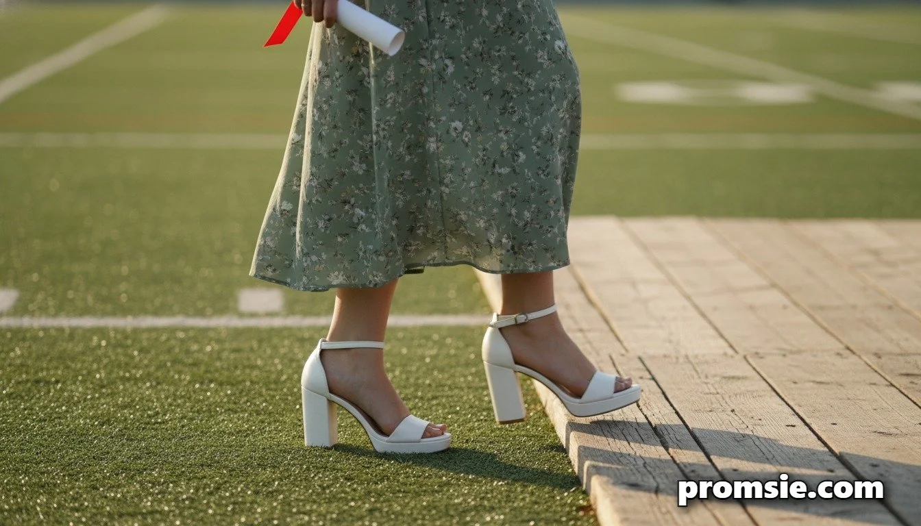 Since you’re walking across a stage (and sometimes across a grassy football field), your shoes are the star of the show. Avoid stilettos! I’ve seen way too many girls trip because their heel got stuck in the grass.